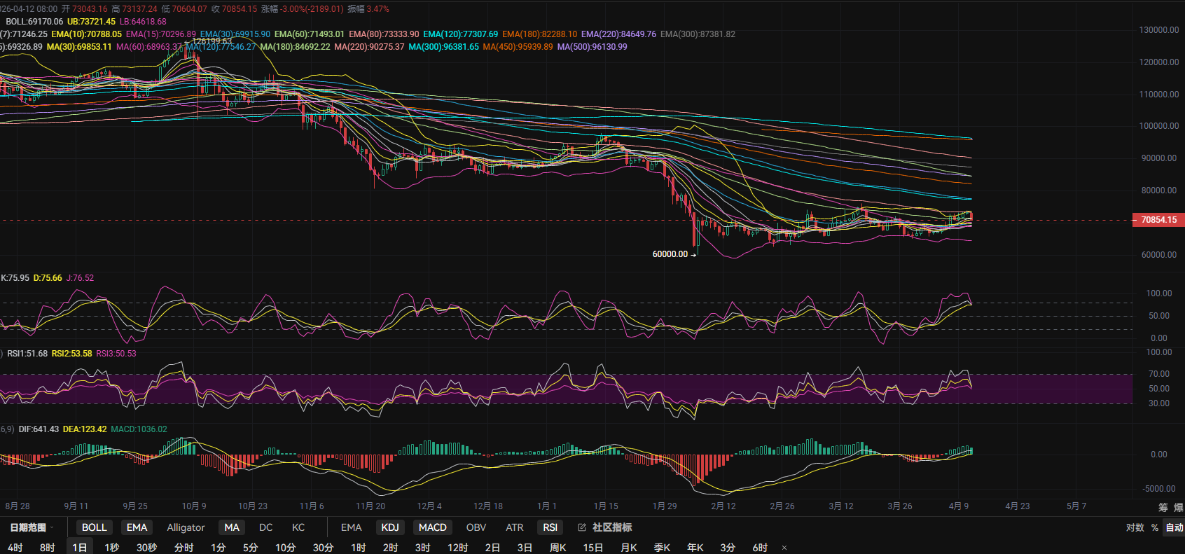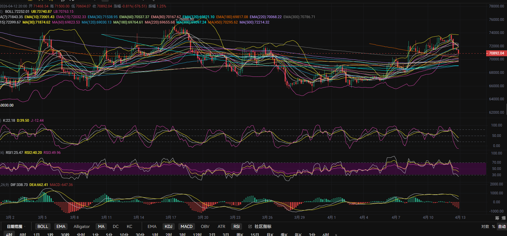 Due to the impact of the US-Iran situation, Bitcoin's market has experienced another decline. Currently, the K-line has broken below the 4-hour middle track, reaching the lower track and the MA450 interval. The bulls are again defending the 70,000 level and the combined support of MA180, MA220, and MA60. In both KDJ and RSI, there are no obvious signals for stopping the decline or oversold rebounds. In the MACD, there is still volume below the zero axis, and the fast and slow lines' dead cross structure remains unchanged. Short-term bears may continue to extend! Lihui suggests that those looking to enter low long positions should be patient and cautious! Since the 4-hour middle track has been broken, it's advisable to pay attention to the pressure levels above, focusing mainly on high short positions unless the EMA30 and MA30 intervals are breached!