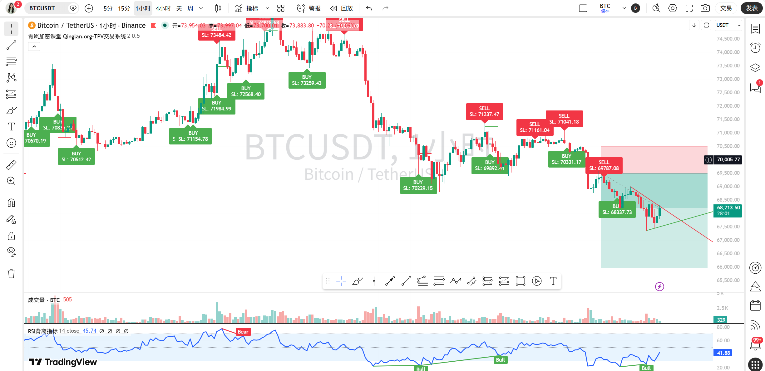 关键入场区域:关注67500-67800美元这个支撑带(参考1小时图低点67360.66和收盘价67859.0形成的区域)。