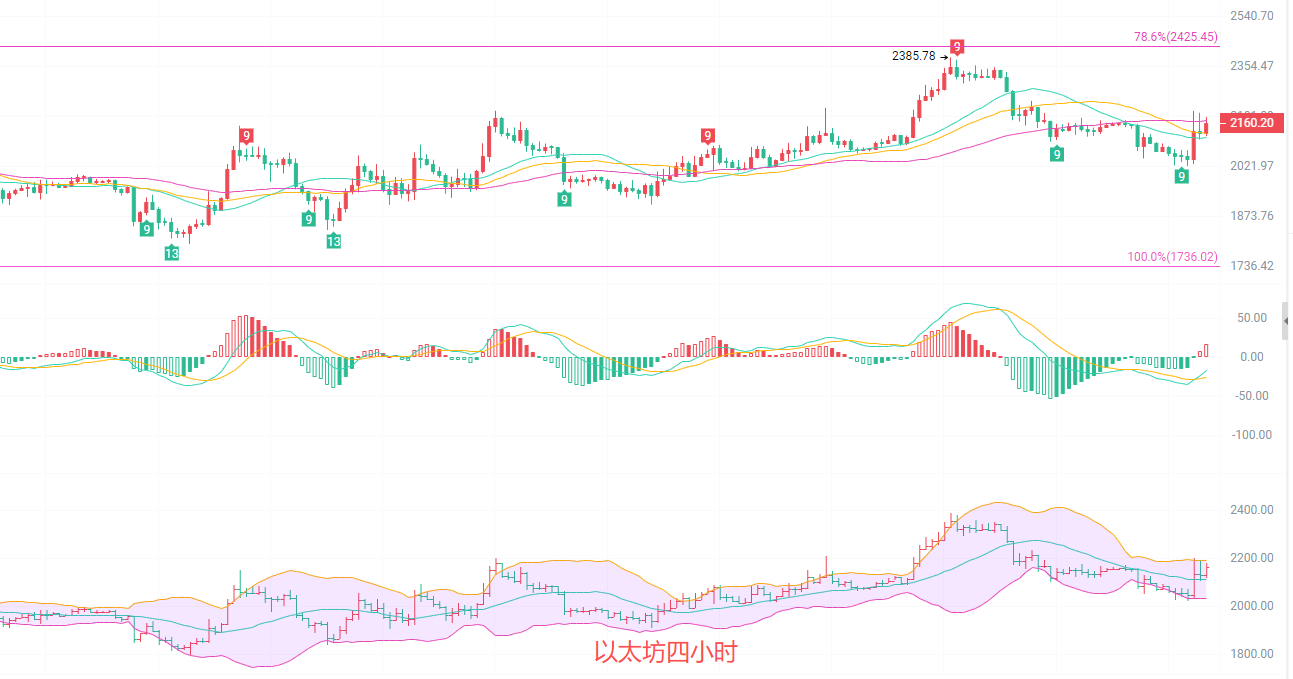 四小时短线反弹,诱多风险仍存,短线走势更清晰,价格从2021低点快速拉升,突破布林带上轨后回落,目前在2160附近震荡,属于急拉后横盘磨底,典型的短线反弹特征。MACD金叉后红柱小幅放量,但DIF尚未站稳零轴,关键位置上方强压在2245斐波那契阻力,下方支撑在2080布林中轨,区间震荡后大概率选择方向,这个时候要做的是等风来