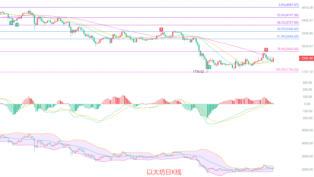日线未破关键压力从1736低点反弹至今,已经收复了前期部分跌幅,但结构上仍在南下框架内,价格反弹至斐波那契0.786阻力位2245下方,尚未突破2385以来的下降趋势线,属于超跌后的技术性修复,并非趋势反转。MACD绿柱收窄DIF即将上穿DEA,但仍在零轴下方,说明北上动能还在积累,价格站上MA20和MA30 均线,但MA60一线2171仍在上方压制,均线南下排列未被完全打破,大周期南下趋势仍占主导。