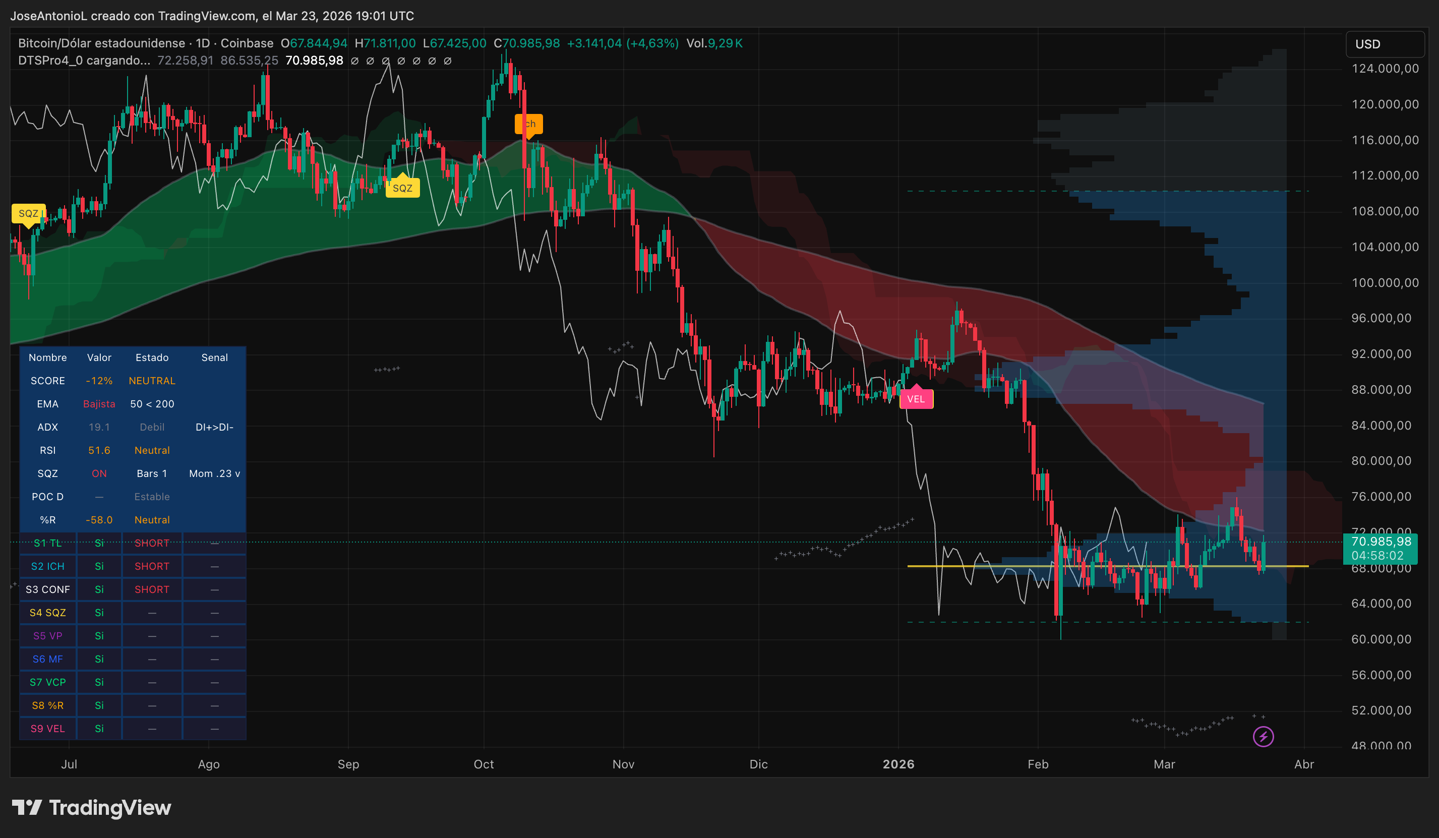挤压动量指标开启,目前动量读数为 0.26。这个数字追踪市场在大动作之前凝聚能量的时机——就像弹簧被压缩或价格在主要趋势后稳定。它现在是开启的,这意味着弹簧正在蓄能。但由于动量仍然较低,我们尚未看到方向。