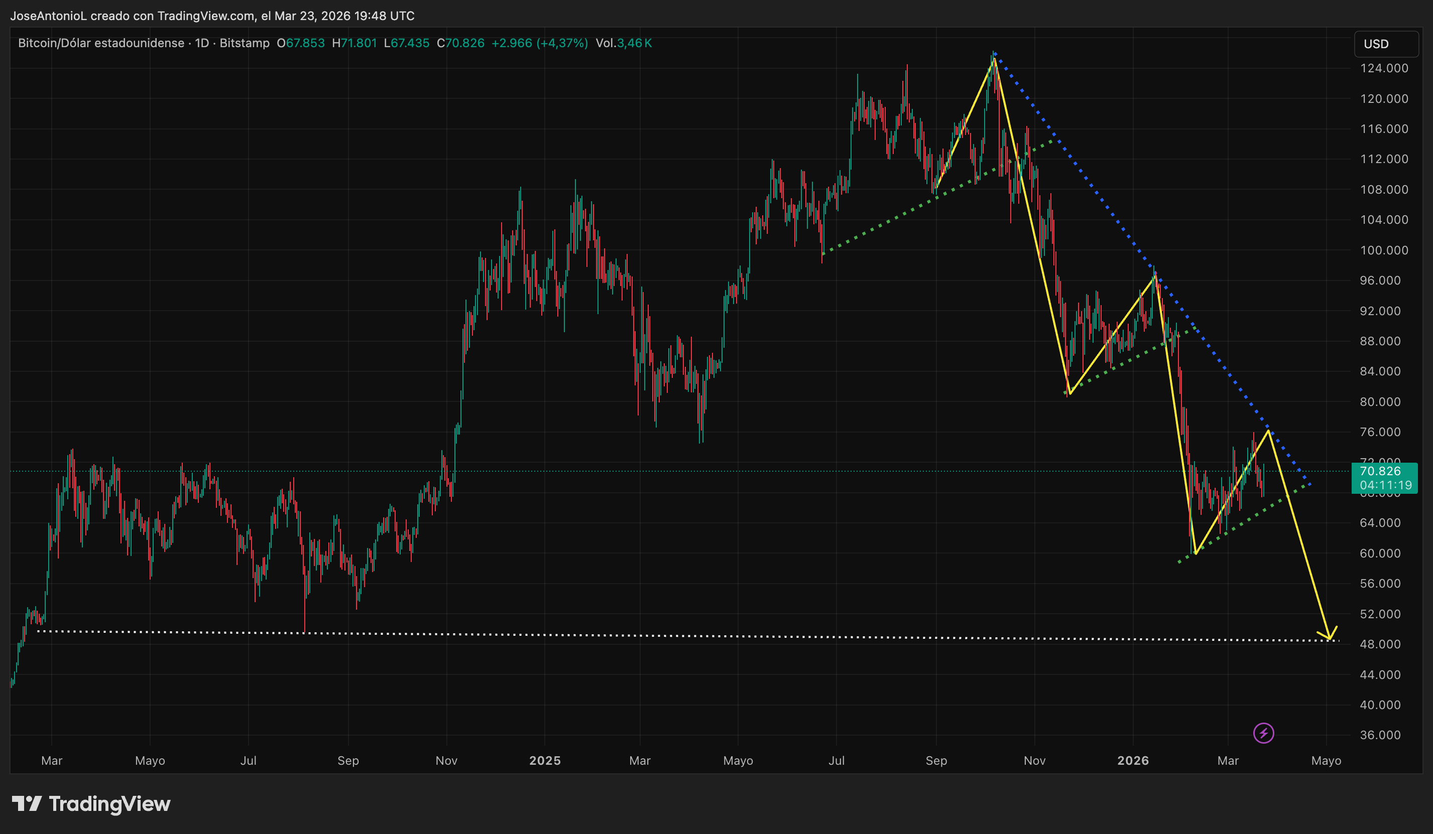 而现在比特币正在形成完全相同的结构。上升支撑线再次充当底部。下降的蓝线就悬在上方,约在 $70,000 左右,具体取决于到达时间。如果该模式成立,那么 2026 年 4 月或 5 月的第三次拒绝将会成为可能。
