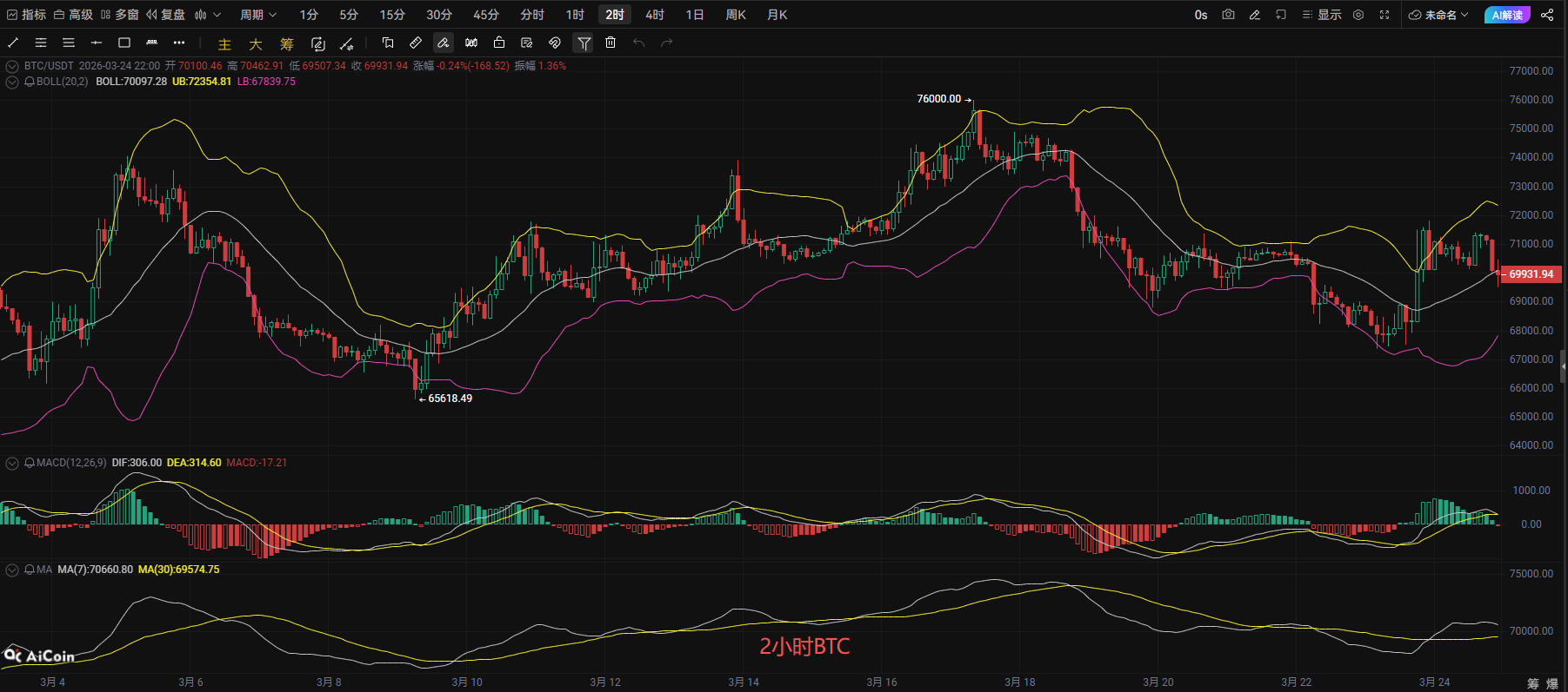 做多策略:70000到69500,目标71000瞄准71500,止损69000