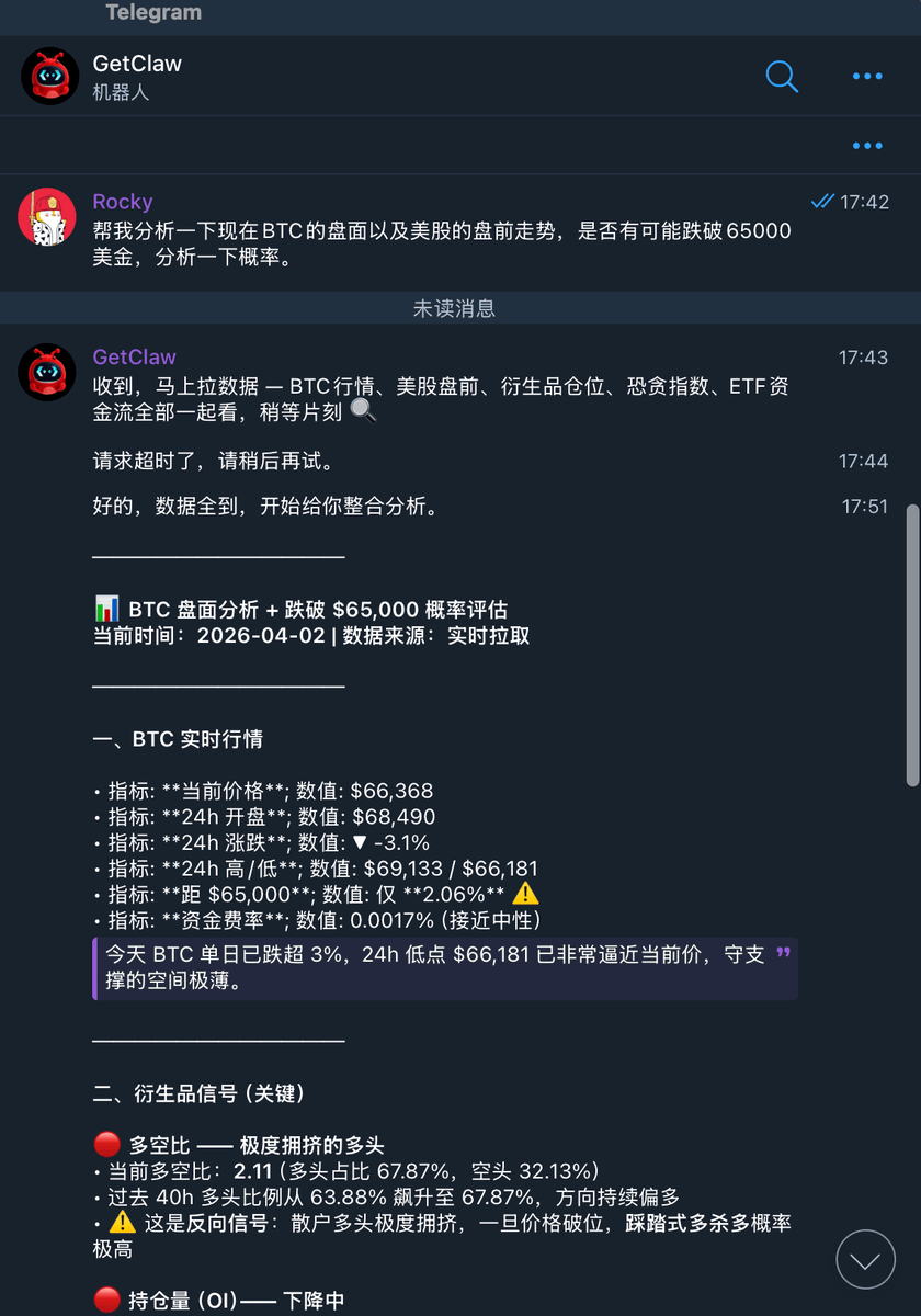 GetClaw算是我体验下来,直接就长在我的爽点上了。以前玩 OpenClaw,得自己整台mac mini或者租云服务器、配环境、配API,门槛其实有点高的。现在好了,Bitget 把这玩意儿直接搬到了云端,只要会用 Telegram 聊天,人人都能带个“AI 专业助理”进场交易。