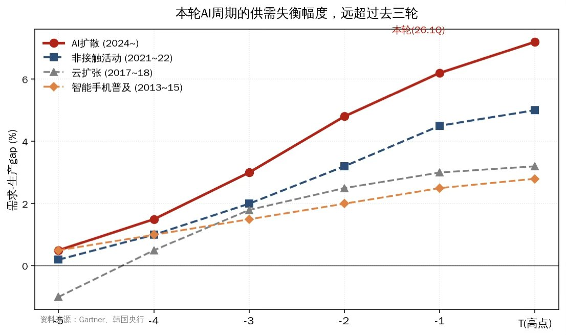 韩国央行判断本轮存储周期的供需失衡幅度和持续时间都明显超过历史三轮,至少到 2026 年上半年扩张确定延续。