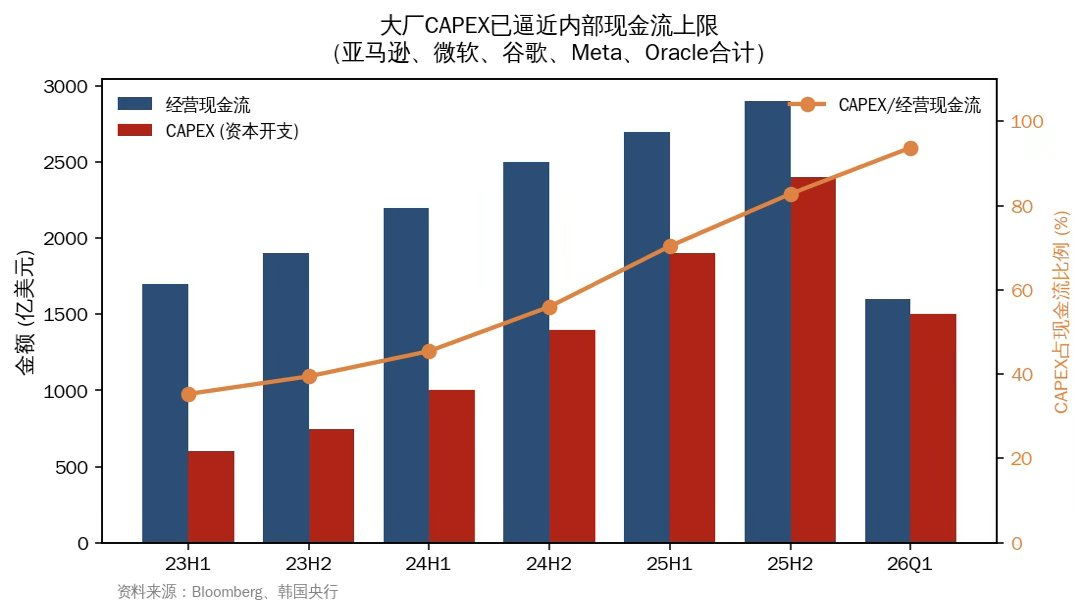 ② 大厂能否持续融到钱。这一段是整份报告最有信息量的部分。BoK 明确把当下和 1990 年代末的电信泡沫做对比,并且指出一个正在恶化的事实,大厂内部现金流已经撑不动这个量级的 CAPEX 了。去年下半年开始,大厂减少回购、大幅发行公司债,部分公司 CDS 利差已经走阔。