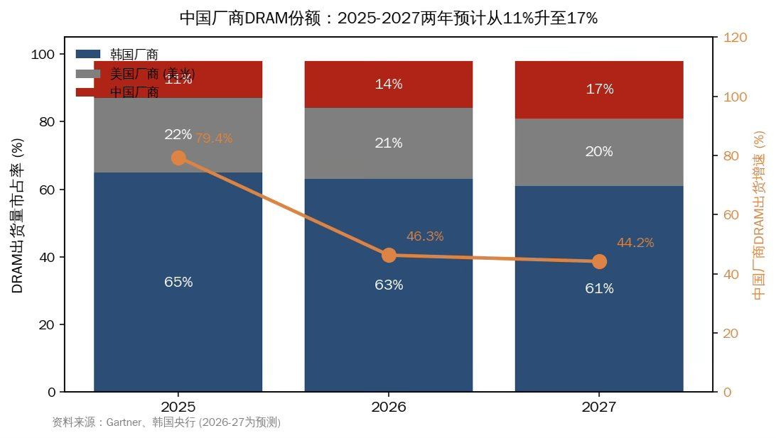 ⑤ 中国厂商的追赶速度。BoK 评估中国和韩国的技术差距大约 4 年,HBM 和通用 DRAM 都是。所以高端格局短期内不动摇。但有一个数字值得注意,中国厂商的 DRAM 出货份额可能从 2025 年的 10.5%升到 2027 年的 17%,未来两年增速是主要存储厂的 3 倍以上。这部分份额会压在通用 DRAM 价格上,加快失衡缓解的时点。