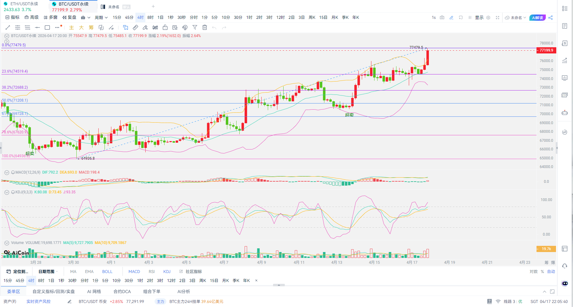 剧本二,冲高回落洗盘。如果价格在77500附近反复试探,放量都冲不上去,那就要小心回踩。第一支撑位看74500附近,也就是斐波那契的23.6%位置。更强的支撑在72680附近,那是38.2%的回调位。