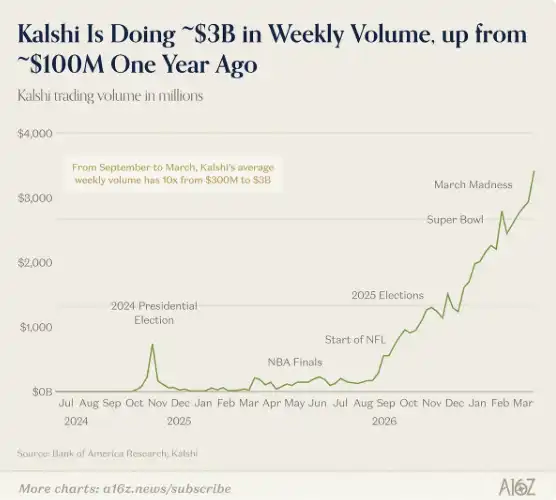 在研究会议召开时,体育类交易的周交易量刚刚接近 30 亿美元,约占 Kalshi 总交易量的 80%,主要由「疯狂三月」(March Madness)所带动。Tarek 与 Luana 将这种高度集中视为一个阶段性的现象。