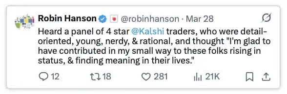 今年三月底,Kalshi 的学术与机构研究部门 Kalshi Research 在纽约举办了首届研究会议,汇集了学界人士、华尔街高管、前政界人物,以及真正推动市场运转的交易员。从与会者的构成可以明显看出一个趋势:这个行业正在「走向成熟」。