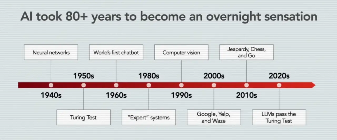 • Marc Andreessen 直接把当下称为 “80-year overnight success”,意思是公众眼中的突然爆发,背后其实是几十年的技术储备被集中释放。