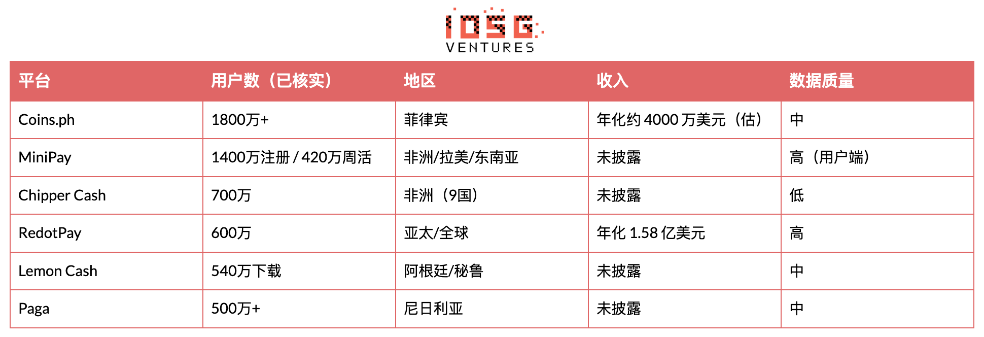 先看现有规模。Telegram Wallet 自称拥有 1.5 亿注册用户(未经核实——低置信度),这个数字先放一边。仅看已核实数据,用户基数就已经非常惊人: Coins.ph 在菲律宾拥有 1800 万已确认用户,主要基于 Tron 的 USDT 轨道运行;MiniPay 作为 Opera 在 Celo 上的移动稳定币钱包,截至 2026 年 3 月注册用户达 1400 万、周活 USDT 用户达 423 万,月交易额 1.53 亿美元,链上活动同比增长 506%(高置信度——来自 Tether/Opera/Celo 联合披露)。Chipper Cash 覆盖非洲 9 国的 700 万用户,近期实现现金流转正。Lemon Cash 下载量 540 万,在阿根廷和秘鲁均排名金融类应用第一,MAU 自 2021 年以来翻了四倍。Paga 在尼日利亚年处理交易额达 17 万亿奈拉,但加密相关占比不明(中置信度)。