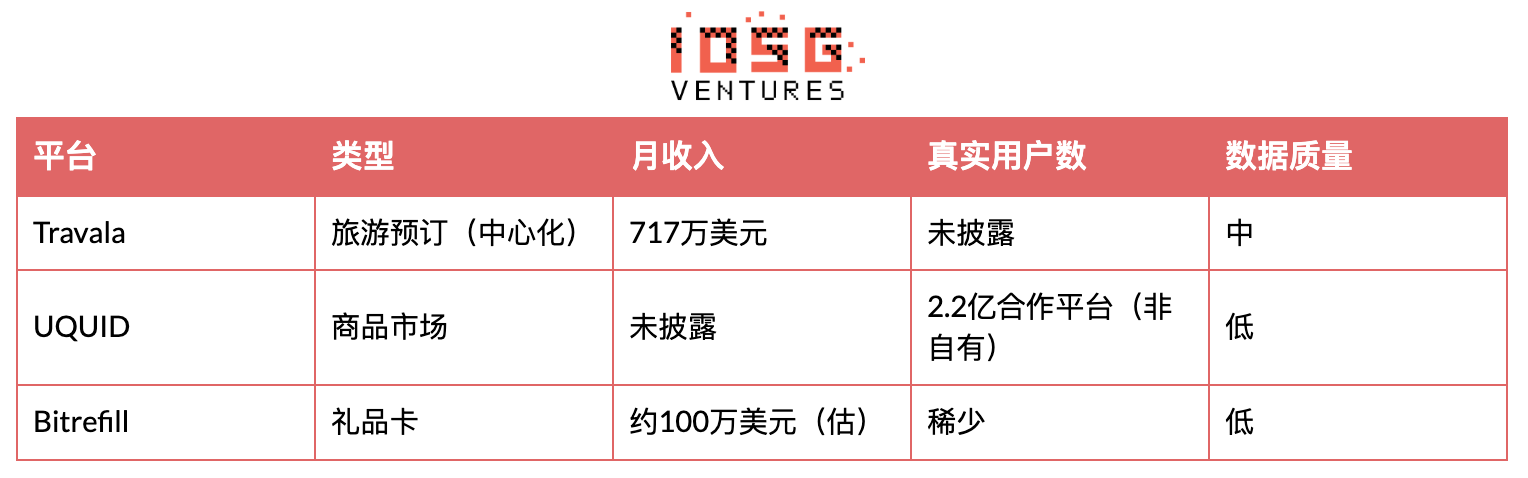 礼品卡和代金券服务商 Bitrefill 月收入约 100 万美元(低置信度——Growjo 估算,历来不精确)。除此以外没有其他值得关注的链上电商协议。