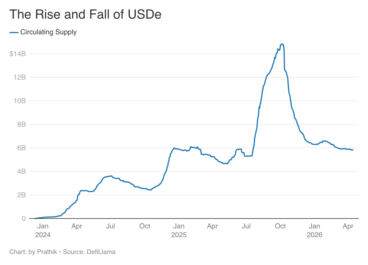 虽然这降低了对加密货币市场的依赖,但它现在的走势与股票、商品或其他资产市场息息相关。每当这些市场波动剧烈、期货市场流动性枯竭时,这些策略也可能失效,并可能进一步挤压 USDe 的收入。