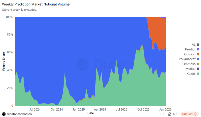 预测市场正迎来超级周期。据 Dune Analytics,预测市场在 2025 年的现象级爆发转向⾼速成⻓阶段,其中 Polymarket 和 Kalshi 双寡头 + BSC 多家强⼒竞争者格局稳固,2025 年累计交易量超 400 亿美元,⽉峰值多次破百亿,2026 年初每周仍维持数⼗亿级别。在主流预测市场中,政治、宏观经济和社会事件类市场的交易活跃度与真实世界的事件热度呈强正相关,验证了其作为 「社会情绪晴⾬表」 的功能。未来更多跨链预测协议、AI 预测增强型市场、链上共享流动性协议都可能参与进⼊。