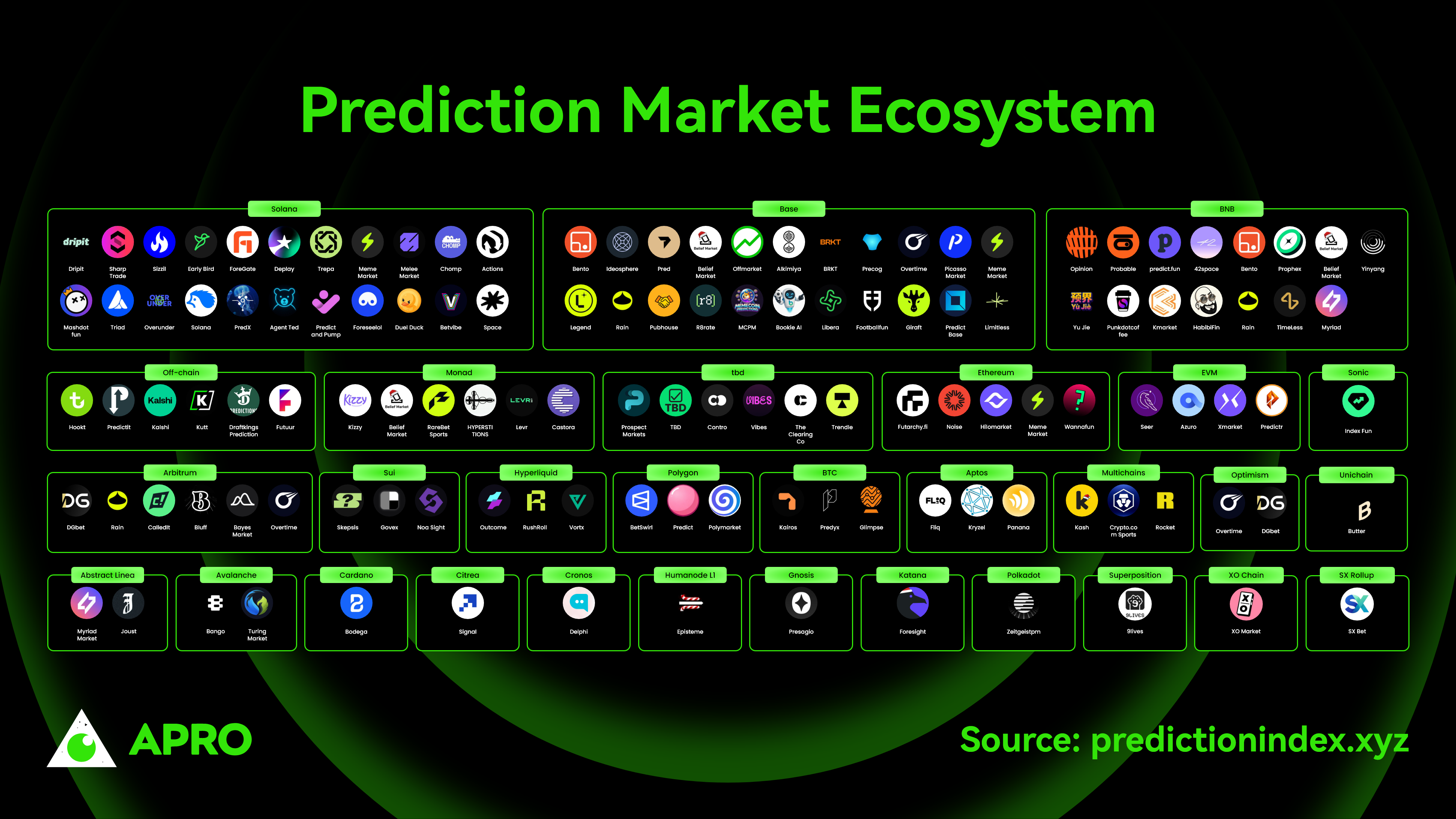 需要注意的是,公链(如 BNB Chain、Solana、Base、Ethereum)和稳定币(USDT/USDC/USD1/U)、DeFi 可组合套件已经⾮常完善,AI 和 DAO 也正在不断演进以满⾜ IEM 发展需求。但整个结构中最后⼀张关键拼图⸺预⾔机仍处于快速发展期。