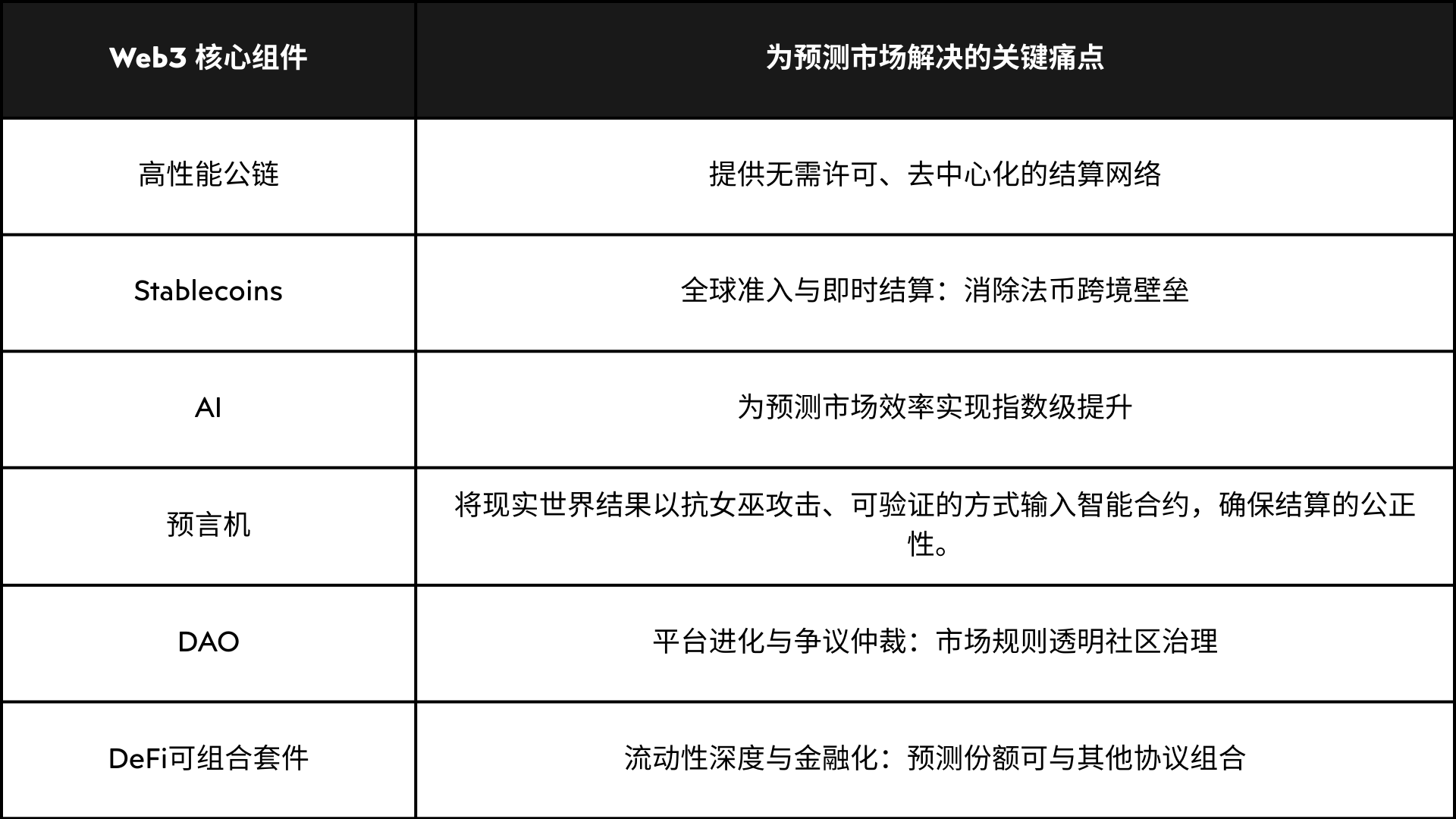 预测市场在 Web2 时代⻓期受限于信任、监管和效率问题,⽽ Crypto 和 AI 从底层架构上为预测市场提供了核⼼⽀撑。Crypto 的去中⼼化特性、智能合约能⼒以及 Stablecoin 全球清结算能⼒,AI 带来的⽣产⼒跃迁,都为预测市场提供了理想的技术和经济环境。