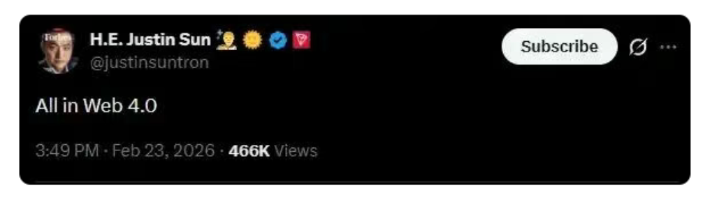 2026年农历新年的余温还未散去,加密世界却被一个名叫“Web4.0”的概念彻底点燃了。这场风暴的中心,站着两位标志性人物:一边是永远在追逐风口的孙宇晨,他掷地有声地喊出“All in Web4.0” ;另一边则是以太坊的精神领袖Vitalik Buterin,他罕见地直接开火,对同一个概念怒斥 “Bro, this is wrong”