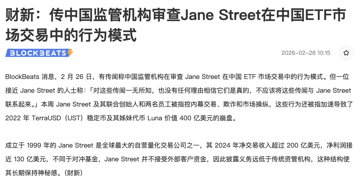 中国监管机构或已在审查 Jane Street 在中国 ETF 市场交易中的行为模式。