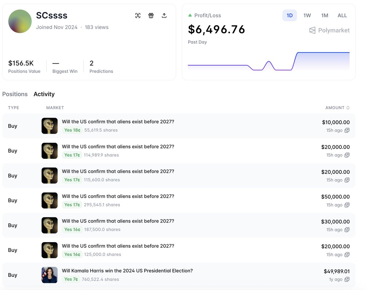 Polymarket 交易者 SCssss 在沉默一年多后突然回归,并花费 15 万美元下注,美国将在 2027 年之前确认外星人的存在,当时赔率仅为 16.8%。